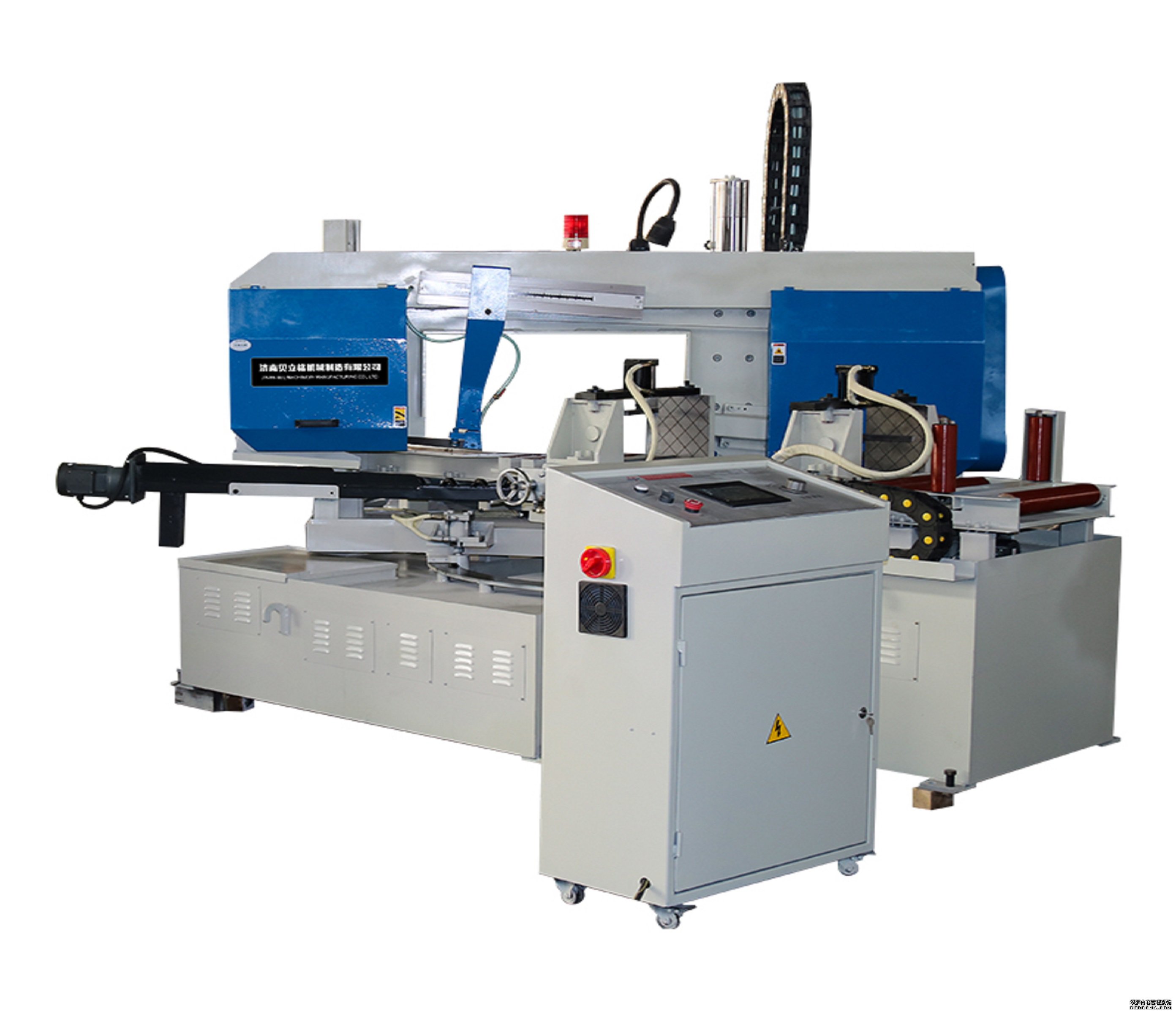 本產品大量應用先進成熟的數控技術,以可編程的PLC控制器替代常規電器控制,大大提高鋸床的工作可靠性;以伺服電機為核心的送料控制系統,實現了送料的高精度;具有人機對話功能的“人機界面”操作面板可實現,多組程序預設,使操作更加智能化,機械操作極為簡便且效率卓越;產品尚屬國內首創,產品各項技術指標處于國內領先并達到國際同類產品先進水平。